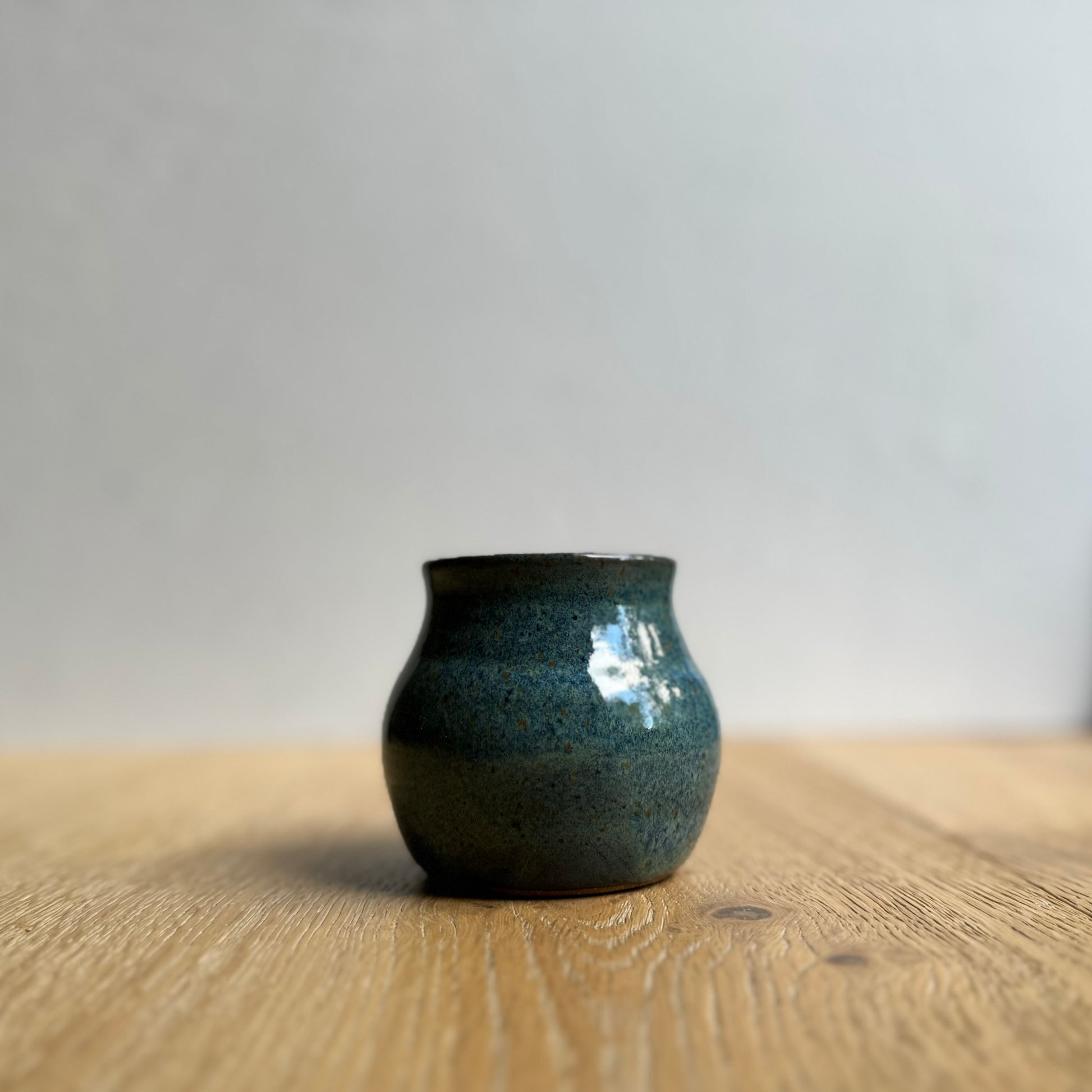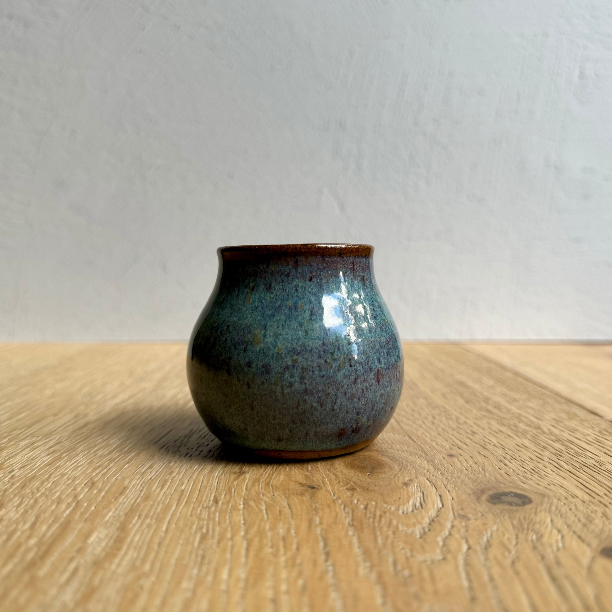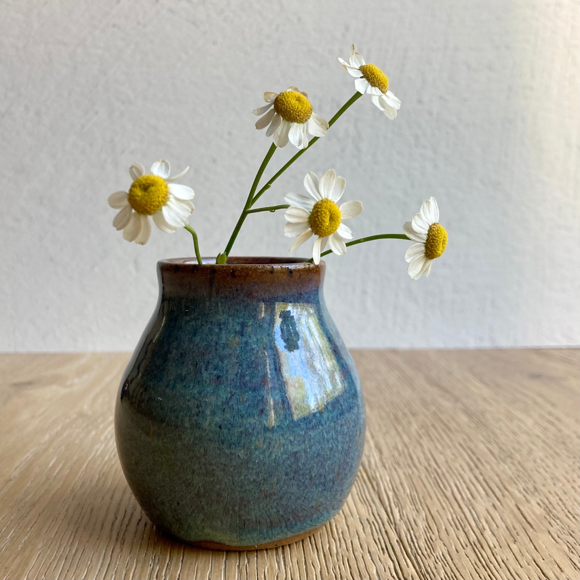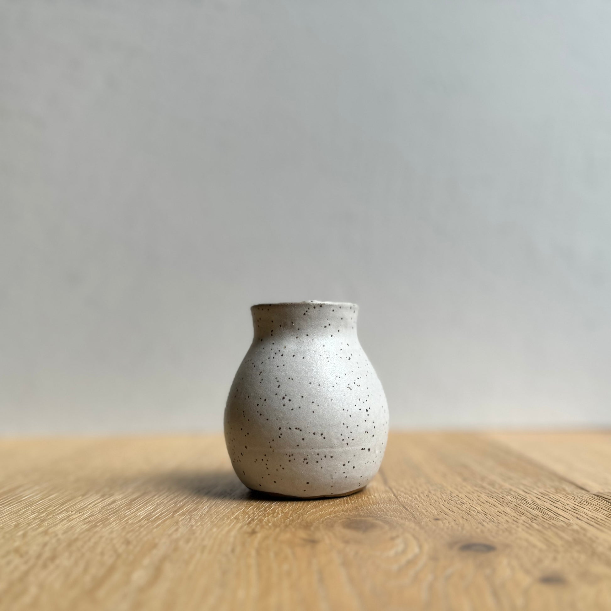 The Bud Vase is wheel thrown with stoneware clay and measures about 3 inches in height.